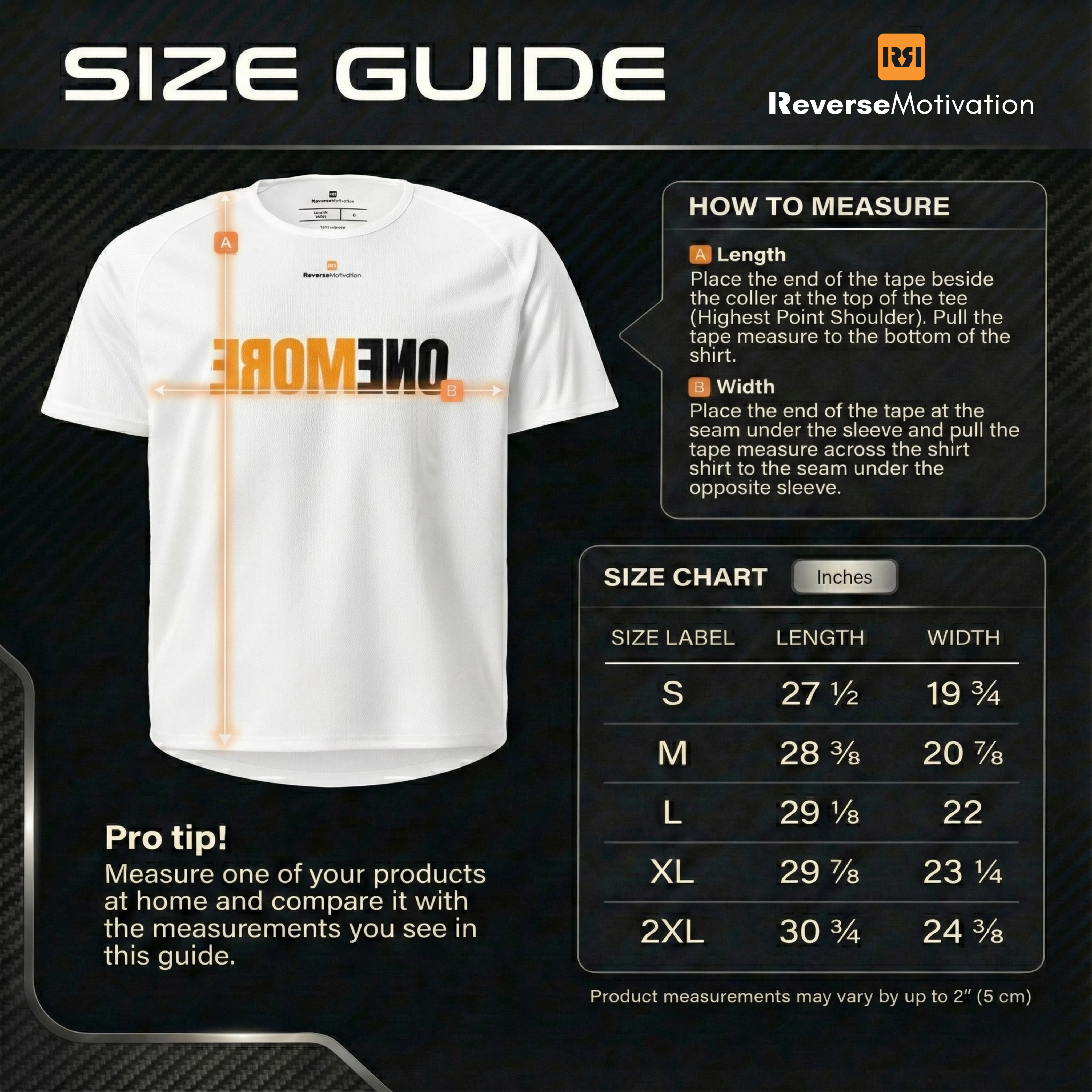 The ONE MORE Horizon motivational workout shirt delivers the RM message in its cleanest form. Designed with a single horizontal line layout, the Horizon style creates a sleek, minimal look that still flips perfectly in the mirror. It is streamlined, modern, and built for athletes who want clarity without distraction when the moment of focus arrives.